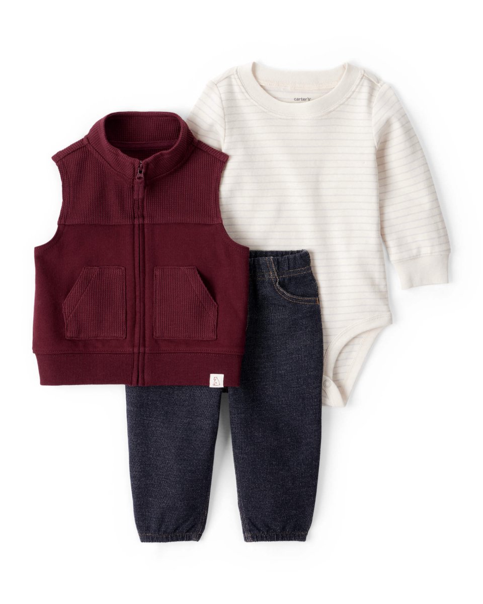 Este conjunto 3 piezas de Baby B’gosh combina estilo y practicidad para el día a día de tu pequeño. Incluye body de manga larga, chaleco con cremallera y pantalón denim con cintura elástica, ofreciendo un look completo y cómodo.