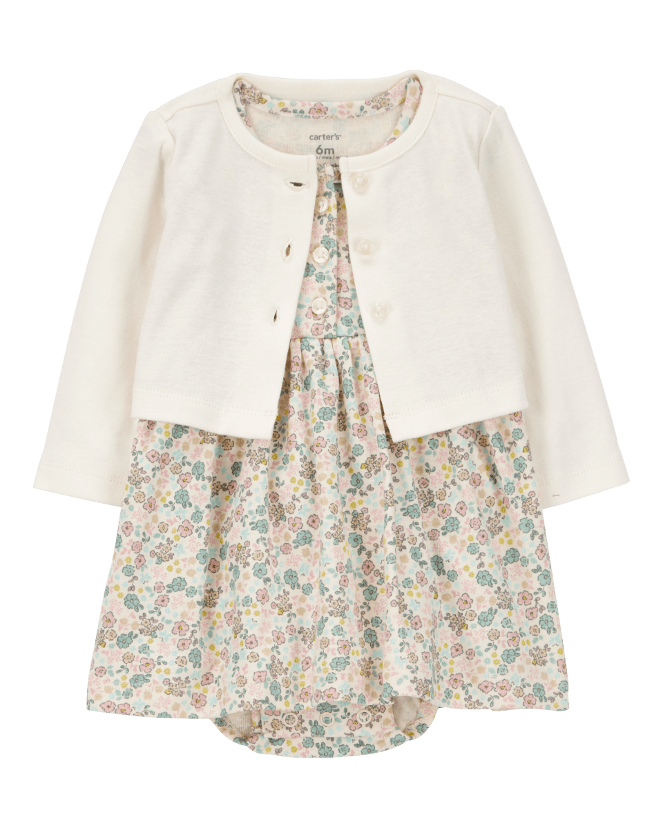 Este adorable conjunto de dos piezas para bebé incluye un vestido floral con body incorporado y un suave cárdigan con botones, ideal para cualquier ocasión. Diseñado en 100% algodón, ofrece suavidad y frescura para la piel delicada del bebé. Además, cuenta con broches reforzados que resisten múltiples lavados sin perder su calidad. Perfecto para mantener a tu pequeña cómoda y con estilo en todo momento.