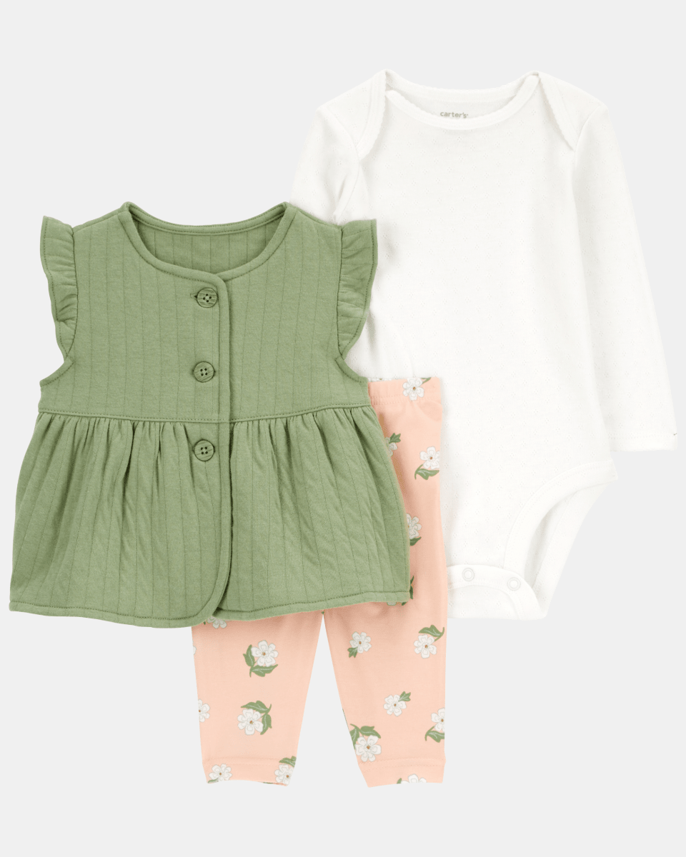 This 3-piece baby girl set includes a quilted vest with ruffle sleeves, a long-sleeved bodysuit, and 2 comfortable leggings with an elastic waistband. Perfect for mixing and matching to create adorable looks, this set is ideal for accompanying your baby on any occasion.