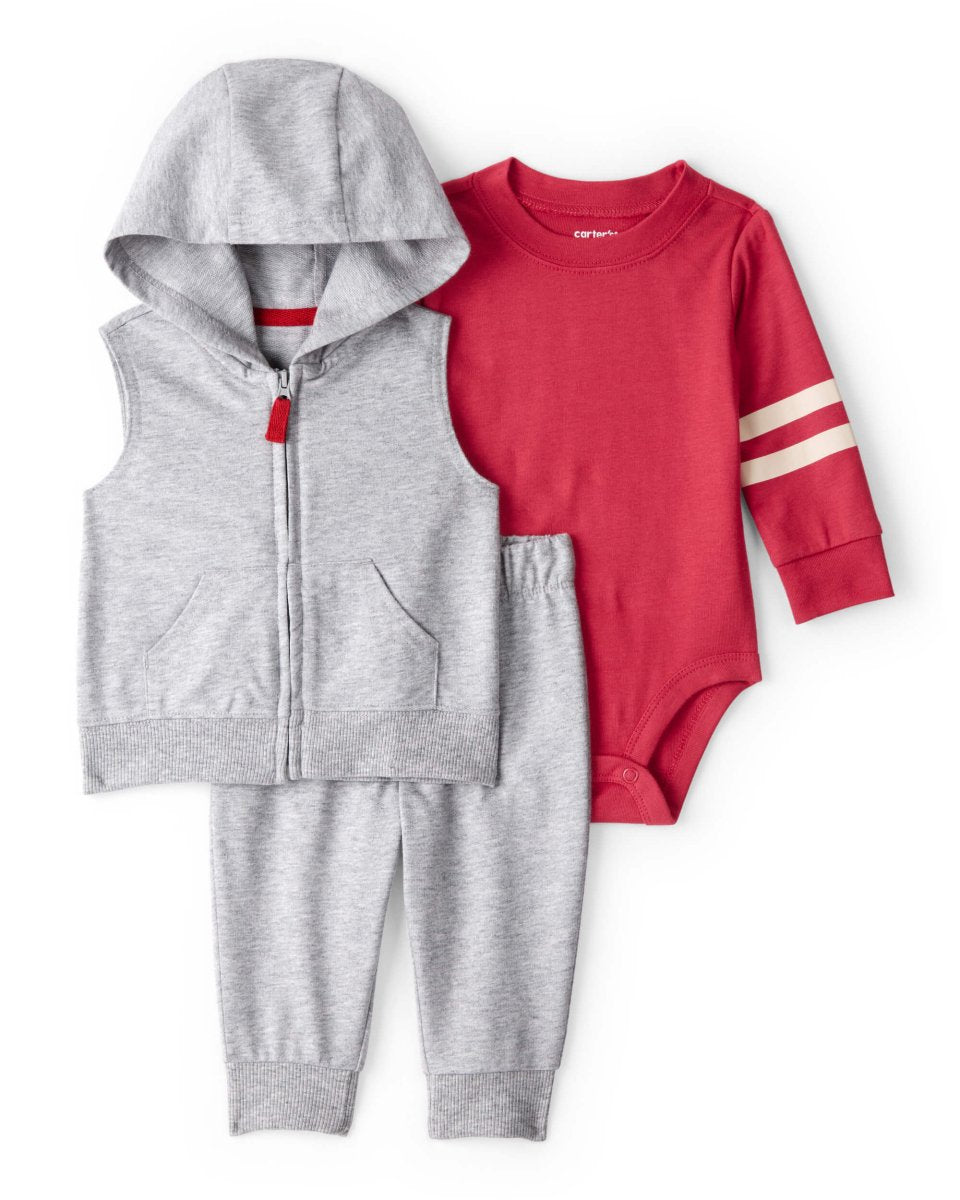 Este conjunto de 3 piezas en tonos grises destaca por su estilo limpio y moderno. Su paleta neutra permite combinarlo fácilmente con cualquier otra prenda, ofreciendo un look suave y equilibrado para el día a día del bebé.