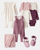 Este paquete de ropa para bebé incluye un pelele largo de algodón suave y transpirable, un pack de cuatro bodies de manga larga con diseños de osos en tonos malva, un conjunto de dos piezas con peto de felpa morado y camiseta, una manta plush rosada para abrigar a los más pequeños, y unos adorables patucos de crochet con diseño de conejito rosa. Confeccionados con materiales de alta calidad y certificados como libres de sustancias nocivas, este conjunto es ideal para mantener a tu bebé cómodo y con estilo. Perfecto también como regalo para recién nacidos.