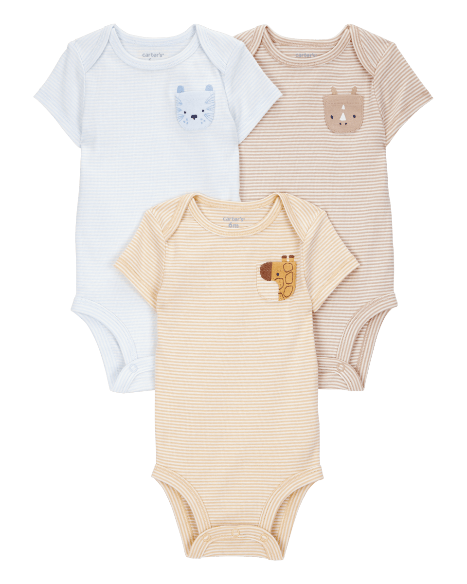 Diseñados con algodón súper suave y llenos de amor, estos bodies originales son simplemente adorables y perfectos para comenzar cualquier conjunto de tu bebé. Este pack de tres bodies de manga corta asegura que siempre tengas uno a mano. ¡Comodidad y estilo para los más chiquitos en todo momento! · Pack de 3 unidades. · Manga corta. · Hombros superpuestos para ponerlo fácilmente sobre la cabeza. · Botones de presión resistentes que aguantan el uso, el lavado y la repetición. · 100% algodón de canalé. · Importado. · Lavable a máquina. · STANDARD 100 by OEKO-TEX®20.HUS.39362.