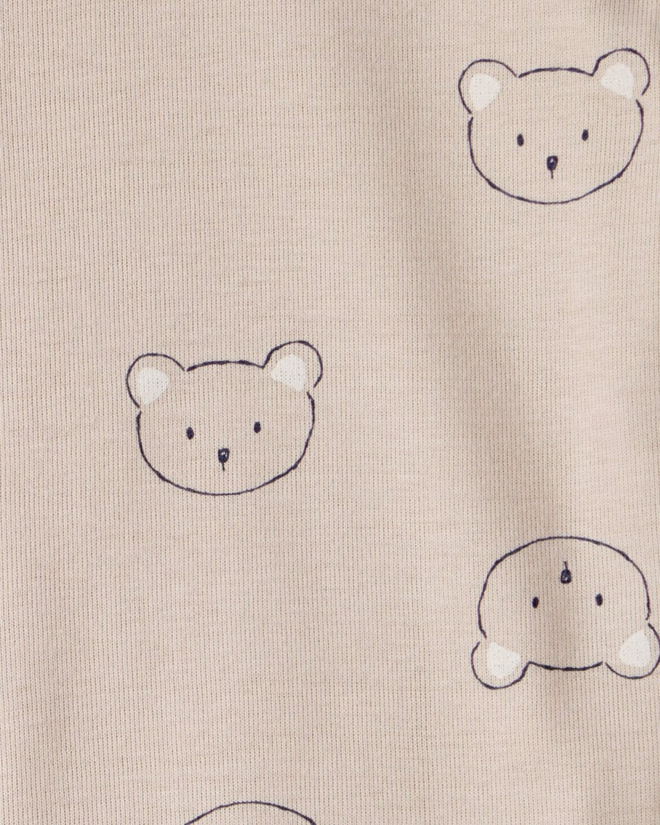Conjunto de tres piezas para bebé que incluye dos bodies de manga larga y un pantalón jogger con diseño de carita de oso. Confeccionado en algodón suave, es ideal para el uso diario, ofreciendo comodidad y facilidad de cambio gracias a los cierres a presión en las piernas. Los tonos neutros facilitan la combinación y el pantalón aporta un toque divertido al conjunto.