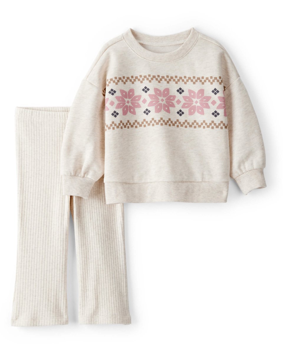 Conjunto para bebé que incluye sudadera con estampado Fair Isle y pantalón a juego. Confeccionado en tejidos suaves y elásticos para ofrecer comodidad durante todo el día, ideal para climas frescos y uso diario.