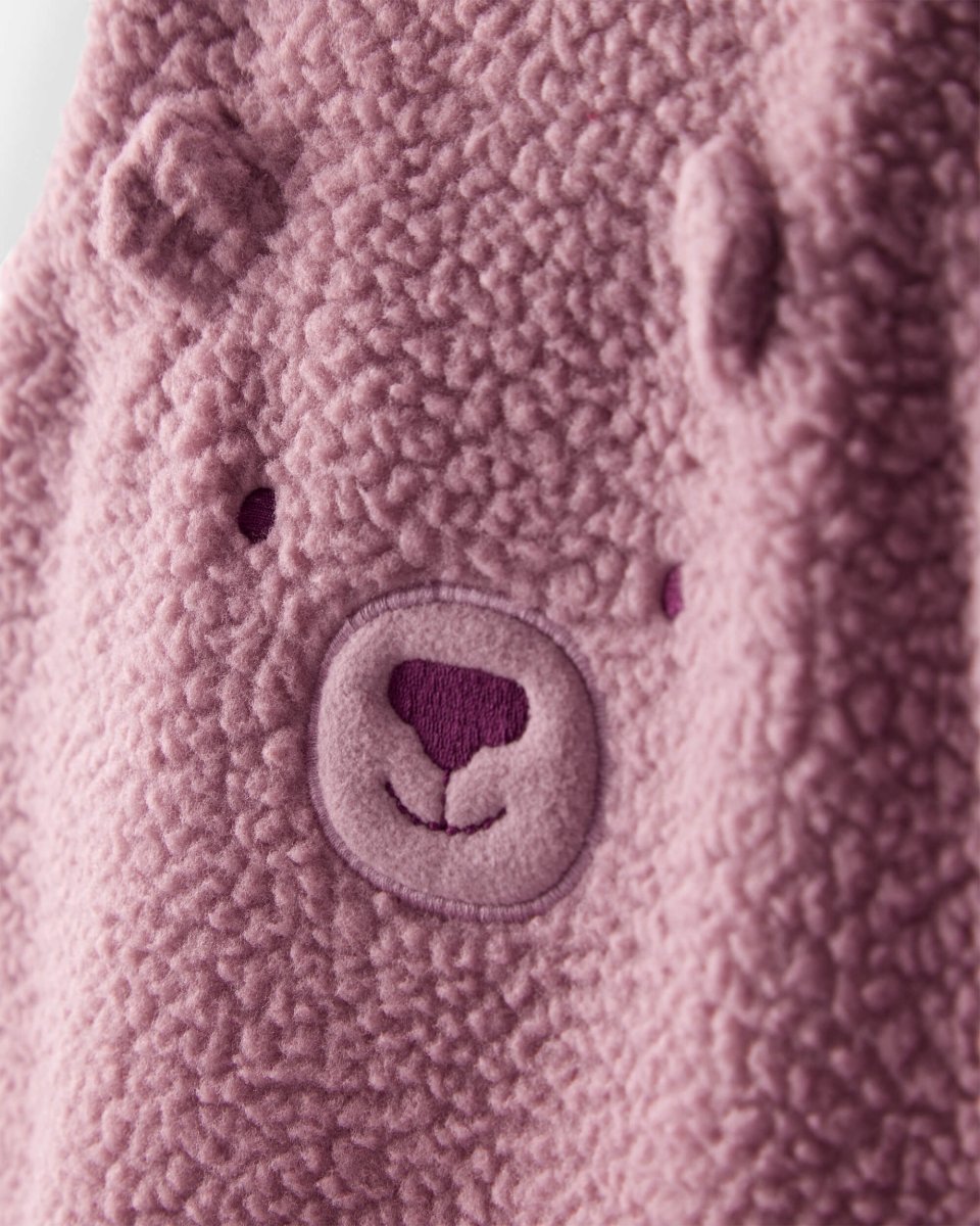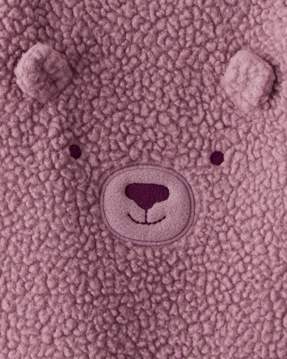 Conjunto de dos piezas para bebé que incluye peto de felpa morado con diseño bordado de oso y camiseta de manga larga a juego. El peto cuenta con cierres a presión en los hombros y entrepierna para facilitar el vestir y el cambio de pañal. Su ajuste cómodo y tejido suave ofrecen calidez y libertad de movimiento para todo el día.