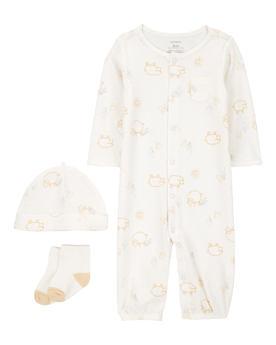 Este conjunto unisex de 3 piezas en color marfil es ideal como regalo y perfecto para los primeros días de tu bebé. Incluye detalles tiernos de pollito y oveja que aportan dulzura y confort.