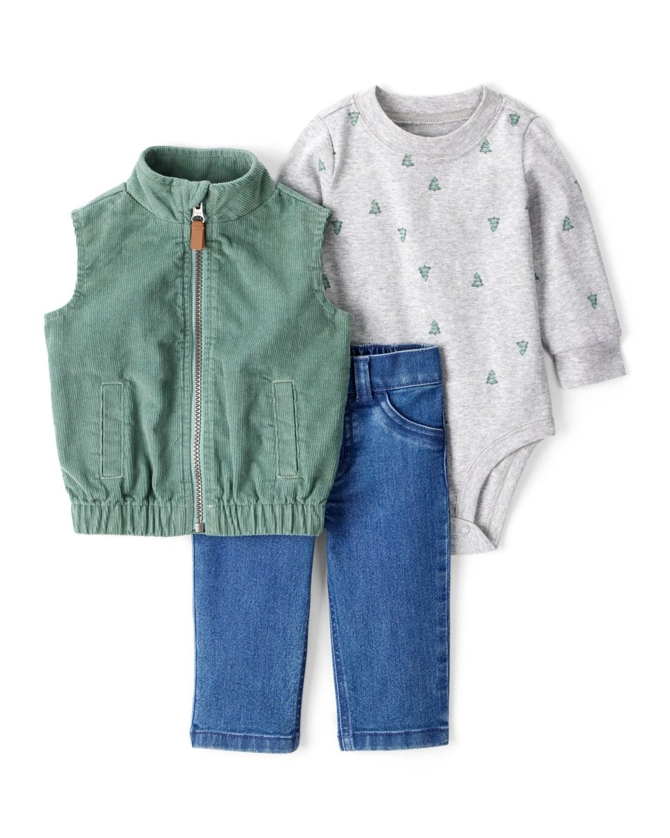 Conjunto de tres piezas para bebé, práctico y versátil, pensado para acompañar cada momento del día con comodidad. Incluye un chaleco de pana con cremallera frontal, un body de manga larga en mezcla de algodón y un pantalón recto tipo denim de corte medio. El pantalón incorpora cintura elástica cubierta para cambios fáciles y un ajuste seguro, además de bolsillos traseros tipo parche que aportan un detalle clásico. Su silueta recta y acabado en tono azul medio lavado lo convierten en una opción ideal para uso diario, desde juegos hasta salidas en familia.