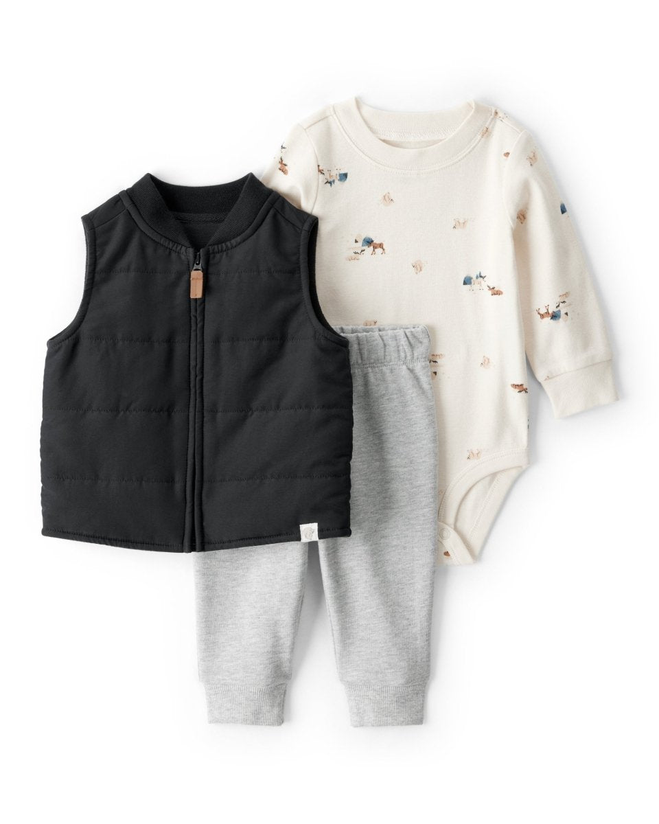Conjunto de tres piezas para bebé que incluye chaleco acolchado negro con cremallera y cuello alto, body de manga larga con estampado de animales y pantalón jogger gris. El chaleco ofrece abrigo sin añadir volumen, ideal para combinar en capas, mientras que el body y el pantalón brindan comodidad durante todo el día.