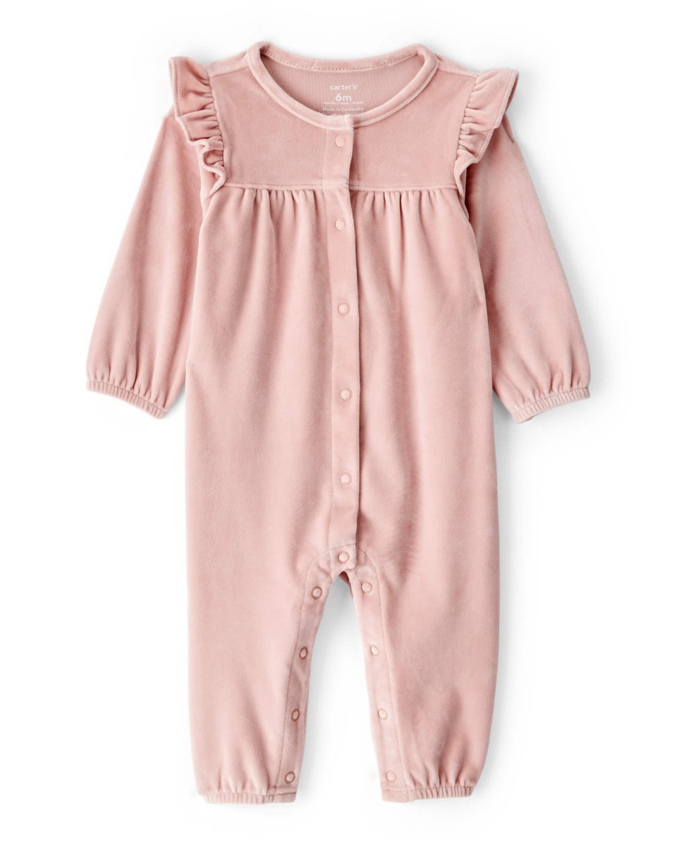 Mono de felpa para bebé en color rosa con manga larga y volantes en los hombros. Su tejido suave y cálido brinda comodidad durante todo el día, ideal para salidas casuales o momentos de juego en casa. Incluye cierres a presión en la parte frontal y entrepierna para facilitar el vestir y el cambio de pañal.