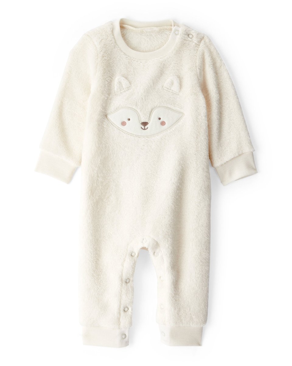 Mono de felpa para bebé con manga larga y diseño bordado de carita de zorro. Ofrece cobertura completa y tejido suave para mantener la comodidad durante todo el día. Cuenta con cierres a presión a lo largo de las piernas para facilitar el cambio de pañal. Ideal para días frescos o para usar en interiores con aire acondicionado.