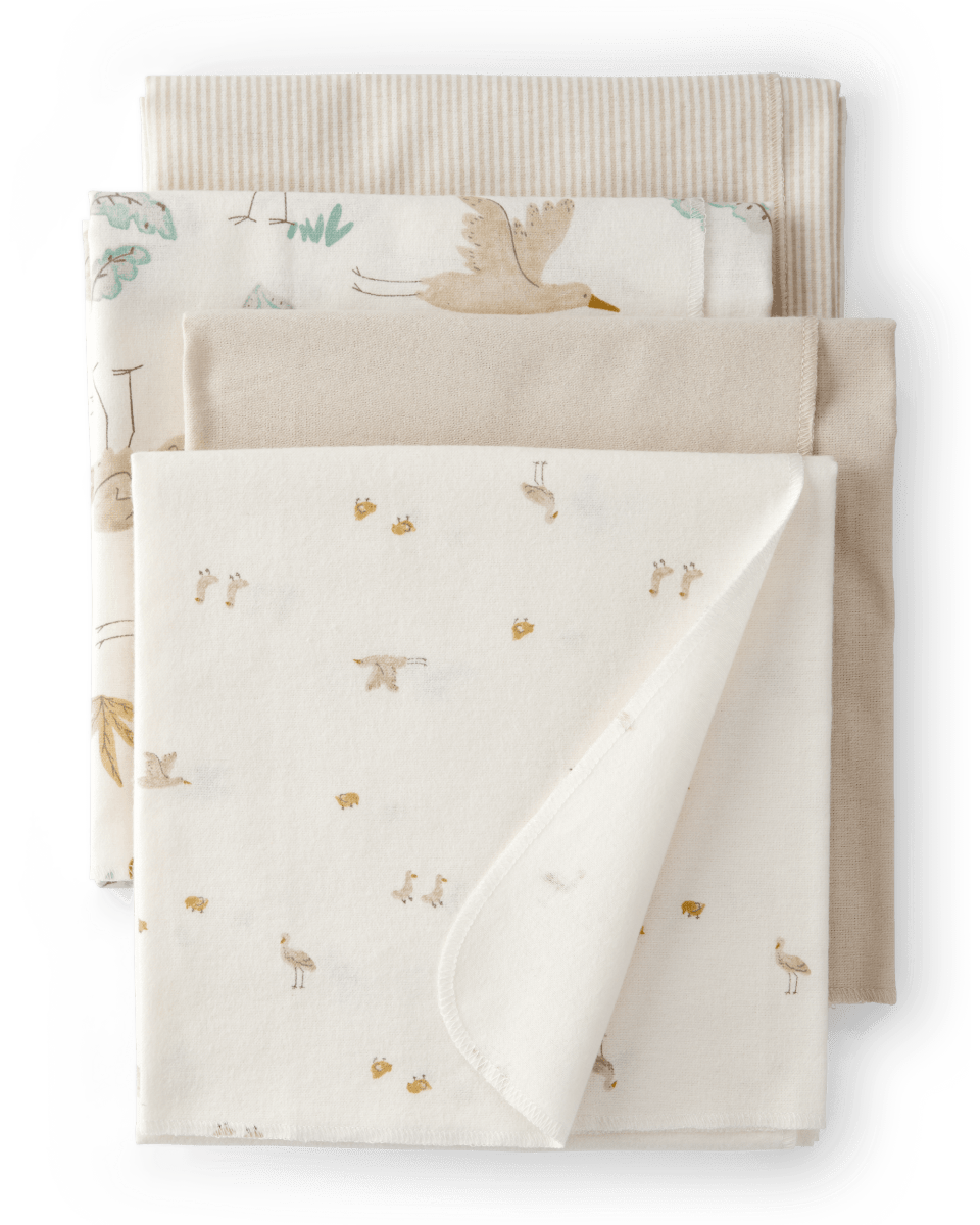 Este pack de cuatro mantas para bebé con estampado de cigüeñas es ideal para envolver, arropar o brindar confort a tu recién nacido. Confeccionadas en 100% algodón suave y transpirable, aseguran comodidad y abrigo en cualquier momento. Perfectas para la piel delicada del bebé. Ideal para recién nacidos como primera muda del bebé.