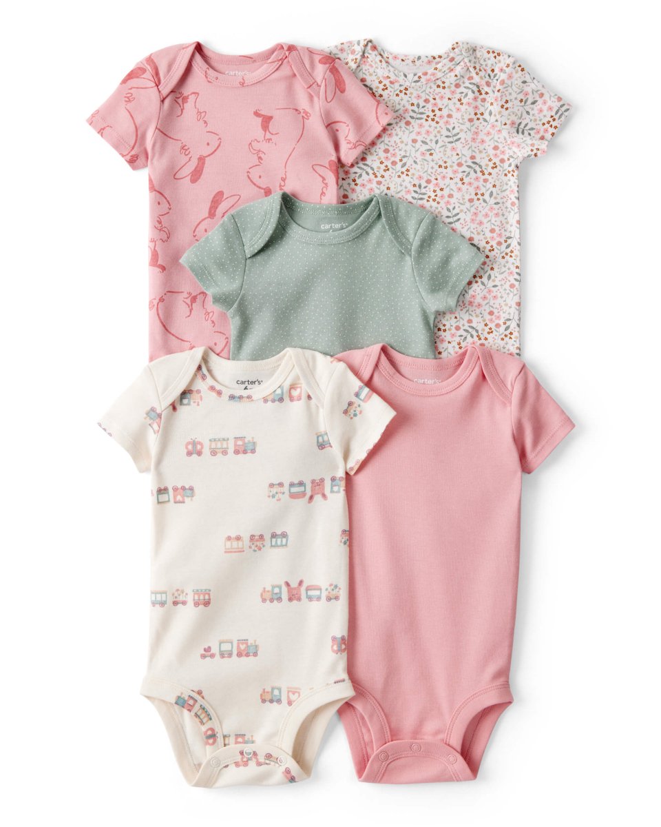 Pack de cinco bodies de manga corta para bebé con diseños surtidos que incluyen tren, conejos, flores y colores lisos. Confeccionados en algodón suave y elástico para ofrecer comodidad durante todo el día, son ideales para usar solos en días cálidos o como capa base en climas frescos. Incluyen hombros superpuestos y cierres a presión en la entrepierna para facilitar el vestir y el cambio de pañal.