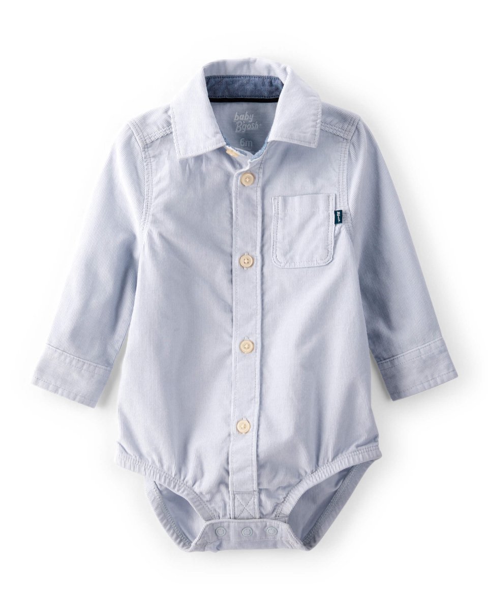 Body para bebé niño con diseño de camisa de pana fina en color azul. Cuenta con botones funcionales en la parte frontal, cuello clásico y bolsillo en el pecho. Incluye cierres a presión en la entrepierna para facilitar el cambio y puños en las mangas para un ajuste cómodo.
