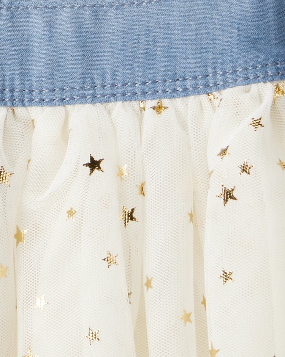 Un diseño perfecto para girar y jugar. Este peto combina la elegancia del chambray con una falda de tul decorada con un delicado estampado de estrellas, ideal para salidas casuales o planes improvisados. Los tirantes ajustables y el corte relajado garantizan comodidad durante todo el día, mientras que su estilo versátil lo convierte en una prenda imprescindible en el armario de tu pequeña.